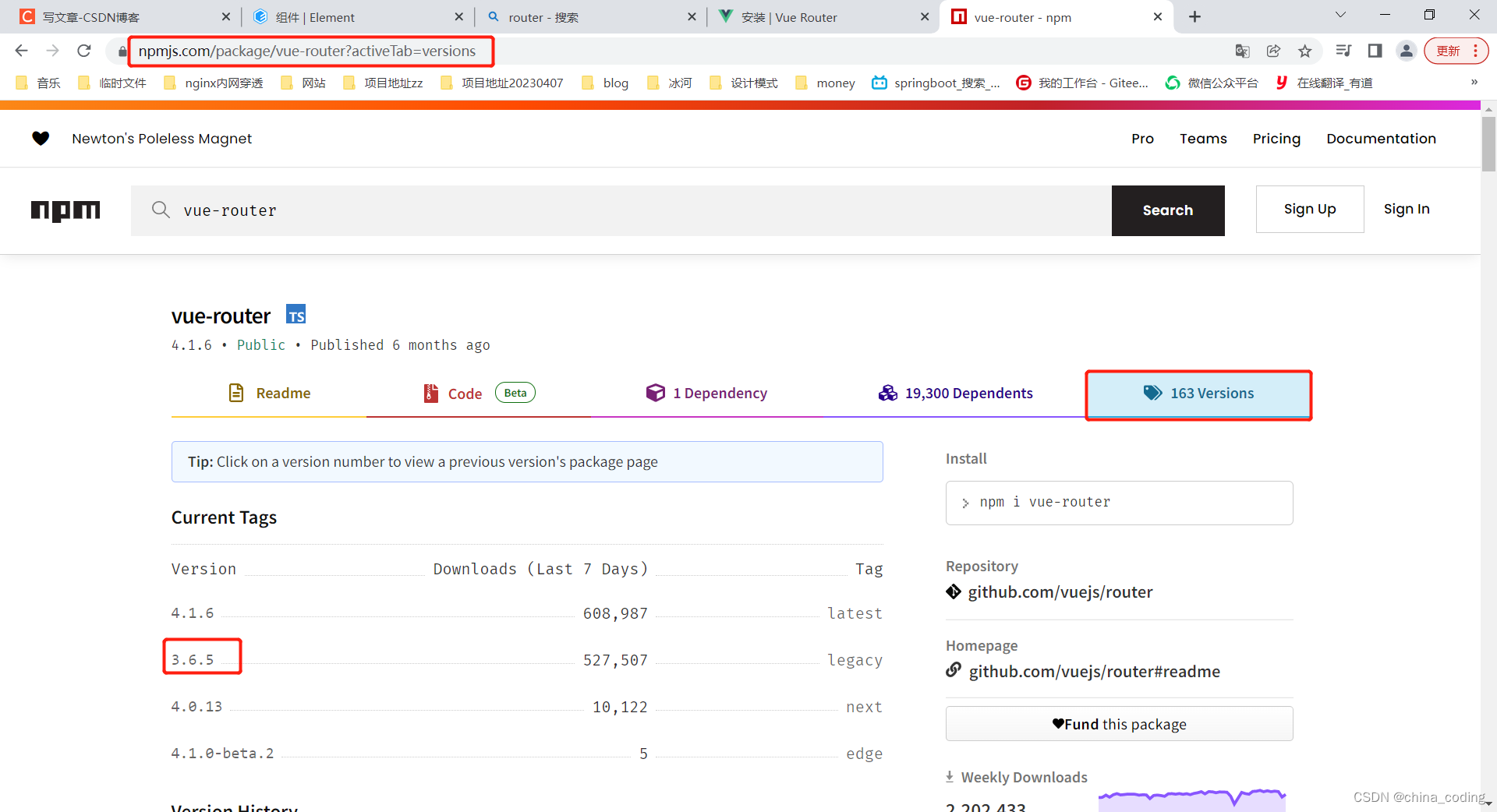 这里使用v3.x的版本 npm.jscom查看vue-router3的最新版本https://www.npmjs.com/package/vue-router?activeTab=versions